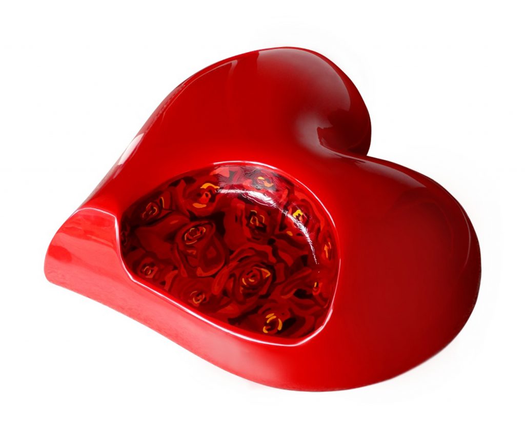 “Con esa práctica que se realiza en ciertas tribus, la mujer pierde una parte de sí, no solo en términos físicos sino también en su propia esencia femenina”, aclara. Otra obra de grandes dimensiones es una silla de madera maciza en forma de corazón, con el asiento pintado con flores, que representa a la mujer que sostiene.