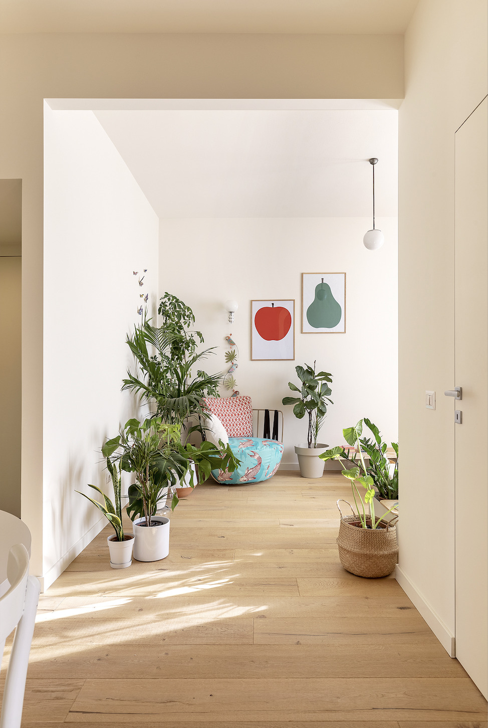 Cuando la propietaria no recibe visitas, la sala es un espacio para la relajación y la lectura. Cuenta con un futón acompañado de diversos cojines y plantas de interior. La iluminación artificial la otorga la lámapra Tolomeo, de Artemide.
