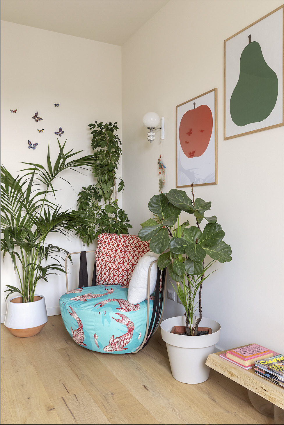 Aunque en esta vivienda cada rincón tiene un encanto especial, dos espacios son dignos de destacar. El primero de ellos es el único dormitorio. Se trata de un ambiente que sorprende y encanta gracias al colorido papel de colgadura referencia Limonata, de la firma italiana Verde Olivia, inspirado en la jungla. Este, sumado a la lencería amarilla, le da a la habitación un atractivo aire pop.