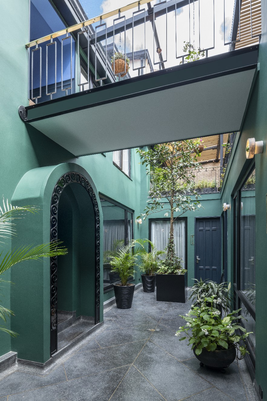 “Conservando la volumetría de la casa histórica, se hizo una adición moderna con un estilo más minimalista usando el ladrillo bogotano. Esta fachada exalta el barrio de Chapinero con unas geometrías simples con tejidos para ayudar con la vista y la privacidad de los cuartos. La volumetría se teje con la casa antigua de una manera muy sutil para no competir con ella sino complementarla”, explica la arquitecta.