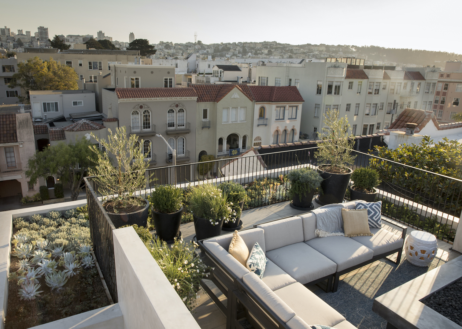 Así, en el deck en la cubierta, el enfoque principal fue resaltar las vistas lejanas a la bahía y al Golden Gate. Entretanto, los dormitorios infantiles disfrutan de acceso directo al jardín. Por su parte, en la sala el patio trasero se diseñó para ser visto desde arriba como un telón de fondo verde para cenar al aire libre. Y, finalmente, en la habitación principal las paredes de vidrio llenan de luz natural el dormitorio, sin que por eso se pierda la privacidad.