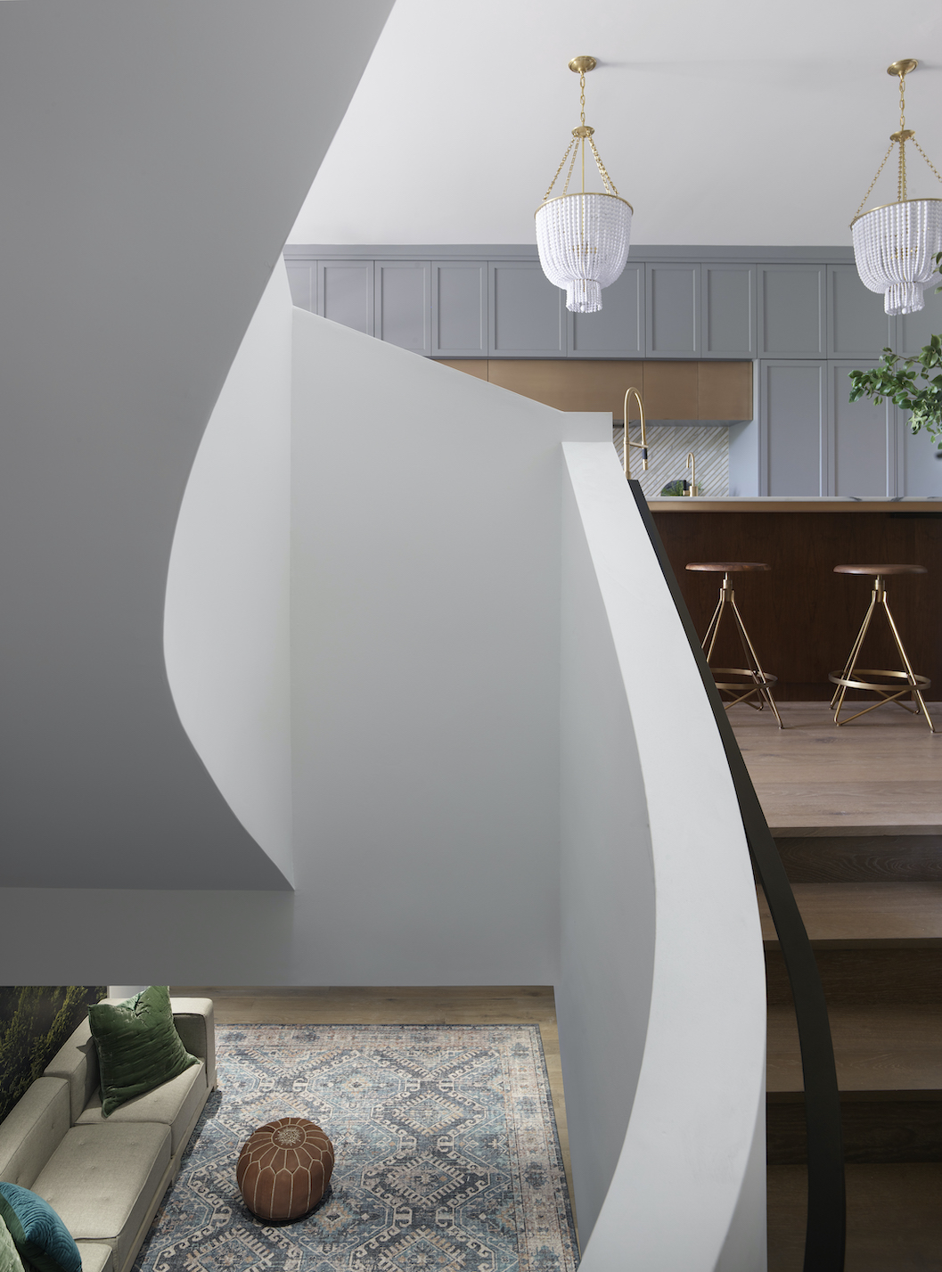 En esta toma se observa parte de la sala de estar y la escalera escultórica que conecta los tres niveles.